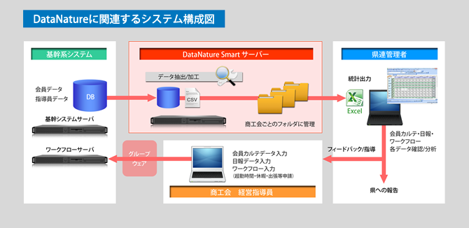 指導員は、年に最低2回は会員事業所を訪問するように指導されているが、すべての会員にまでは手が回らず、年に1度も訪問できていない場合もあるという。「以前は会費徴収のために訪問し相談等を受けるきっかけにもなっていたが、口座自動振替になり、付き合いはますます希薄になっています。商工会を認知・活用してもらうには、指導員からの積極的なアプローチが重要です。そのために、訪問頻度の指標となる『巡回浸透率』(担当する会員すべてに年1回以上訪問すれば100%)を、商工会/指導員ごとに日々DNSで把握し、対策を指導しています。」と大林課長。 それでは、指導員の活動とデータの流れに注目して、運用イメージやその効果を説明しよう。 指導員は、訪問状況や指導の内容を会員ごとにつくられた「カルテ」に入力するとともに、1日の活動を「日報」に取りまとめる。入力されたデータは、基幹系システムに逐次蓄えられていく。また、グループウェアを介し、指導員が入力した超過勤務時間・休暇・出張等のワークフロー・データも基幹システムに取り込まれている。それらのデータはDataNature サーバーにより毎日夜間に更新され、大林課長がDNSを使ってExcelに出力し、統計/分析を加えた上で、各商工会へフィードバックするとともに、県への報告資料としても活用している。 「指導員の活動状況や業務内容を詳細に把握するためには、従来は日報とカルテのそれぞれ異なるフォームのデータを突き合わせなければならず大変でした。DNSが両データをマッチングしてくれるので、指導員の活動と会員の状況を簡単かつ一元的に管理できるようになり、非常に助かっています。」と大林課長は評価する。 また、きめ細かなチェックもDNSがサポートしている。例えば、コメント欄に一定以上の入力がない日報の検索や、訪問日と入力日の差をもとに、日報入力が遅れずに行われているかなどの検索も簡単に設定し抽出することができるので、指導員への注意喚起もタイミングを逃さず、効率良く行うことが可能になった。